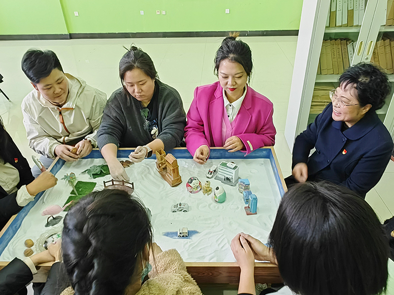 “3.25善爱我”心理健康日之际,为切实加强学校女教职工心理健康教育工作,引导女教职工关注自身心理健康,疏解心理压力,培育乐观心态,以积极健康的心态投入工作和生活中,2024年3月29日下午,辽宁理工职业大学妇委会在北校区主楼心理健康教育中心开展“以沙读心,释放心声”沙盘团体心理辅导活动。本次活动邀请学校心理健康教育中心王玉娥、贾威、黄靖然、赵诗嘉四位老师作指导。党委副书记蔡红武莅临活动现场。