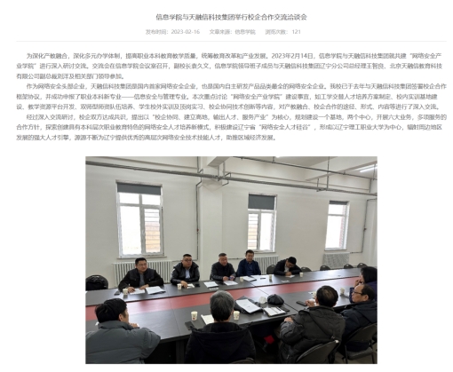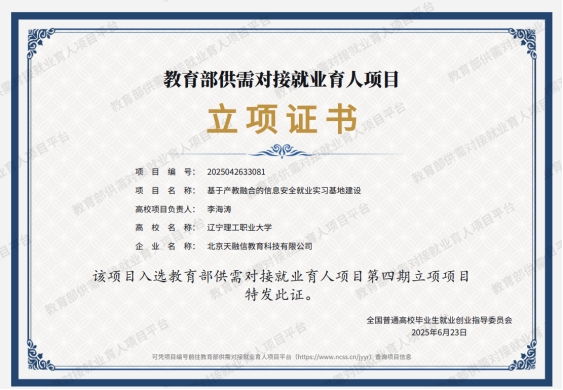 辽宁理工职业大学与北京天融信网络安全技术有限公司 于 2023年4月12日 正式签约共建网络安全产业学院。产业学院的核心目标:建设辽宁省“人才硅谷”,为辽宁及周边地区输送优秀的网络安全从业人员。核心理念:“聚集人才、建立高地、输出人才、服务产业”。规划蓝图:打造以“一个基地,两个中心,六大业务,多项服务” 为目标的实体化运行学院。目前,建设运行的网络安全实训基地涵盖专业共建、实训中心、认证培训、师资培养、科研服务、实习就业等六大方面。该基地包括信息安全实训中心(校内)和天融信锦州市网络安全职业认证授权培训两大中心,集实践、培训、鉴定、服务功能于一体。