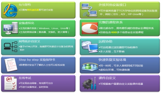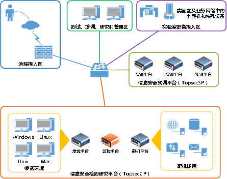 信息安全实验室能够模拟:业务系统出口安全区域、DMZ安全区域、内网接入安全区域、以及安全研究专区,这些模拟环境已经涵盖了目前所有企事业单位的大部分安全单元。