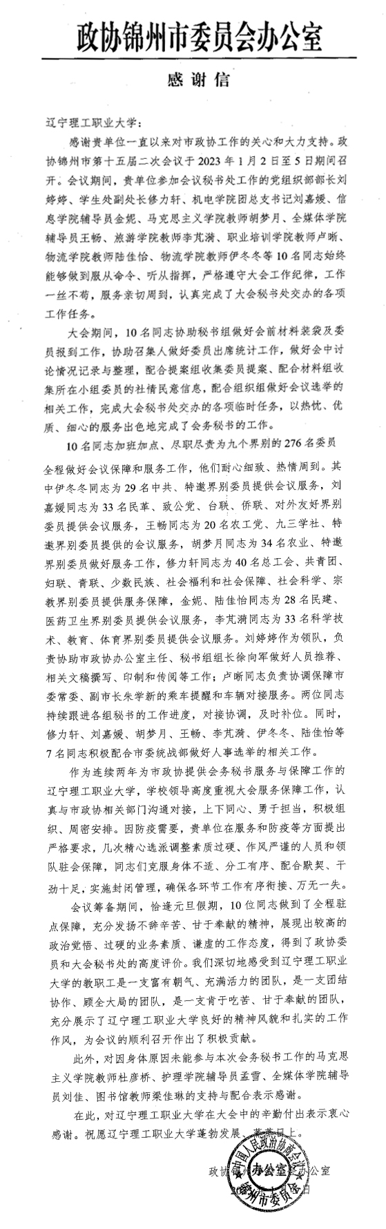 2023年1月6日,辽宁理工职业大学收到政协锦州市第十五届委员会第二次会议秘书处的感谢信。信中对该校党委组织部部长刘婷婷、学生处副处长修力轩、机电学院团总支书记刘嘉媛等10名同志在参与政协锦州市第十五届委员会第二次会议志愿服务工作表示充分的肯定,对该校大力支持锦州市政协工作表示诚挚的感谢。