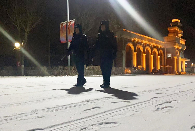 22时30分,月光下的雪面上,留下一串串脚印,那是保卫人员在进行夜间的校园巡逻,他们用脚步丈量、踏实校园的安全防线。