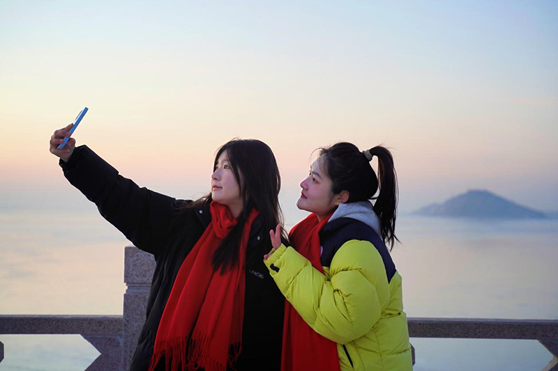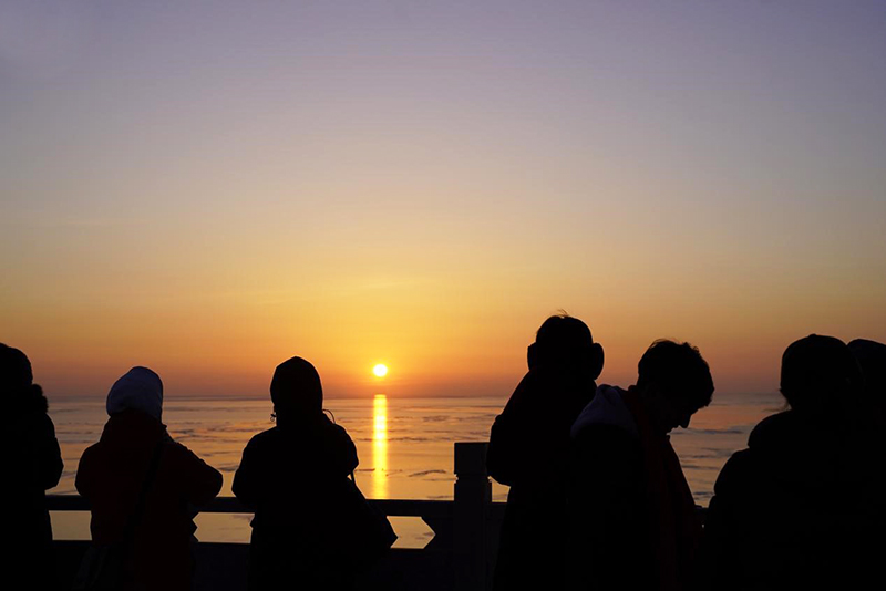 7点20分,海天一色,东方的天际泛起绯红,此时,正如巴金笔下所描写的“红日周围,霞光尽染无余,那轻舒漫卷的云朵,好似身着红装的少女,正在翩翩起舞”。同学们被这美景深深感染,纷纷拿起手机记录下新年的第一缕阳光,并许下对新年的美好期盼。欢歌笑语汇成一片,火红的朝阳温暖着每个人内心。