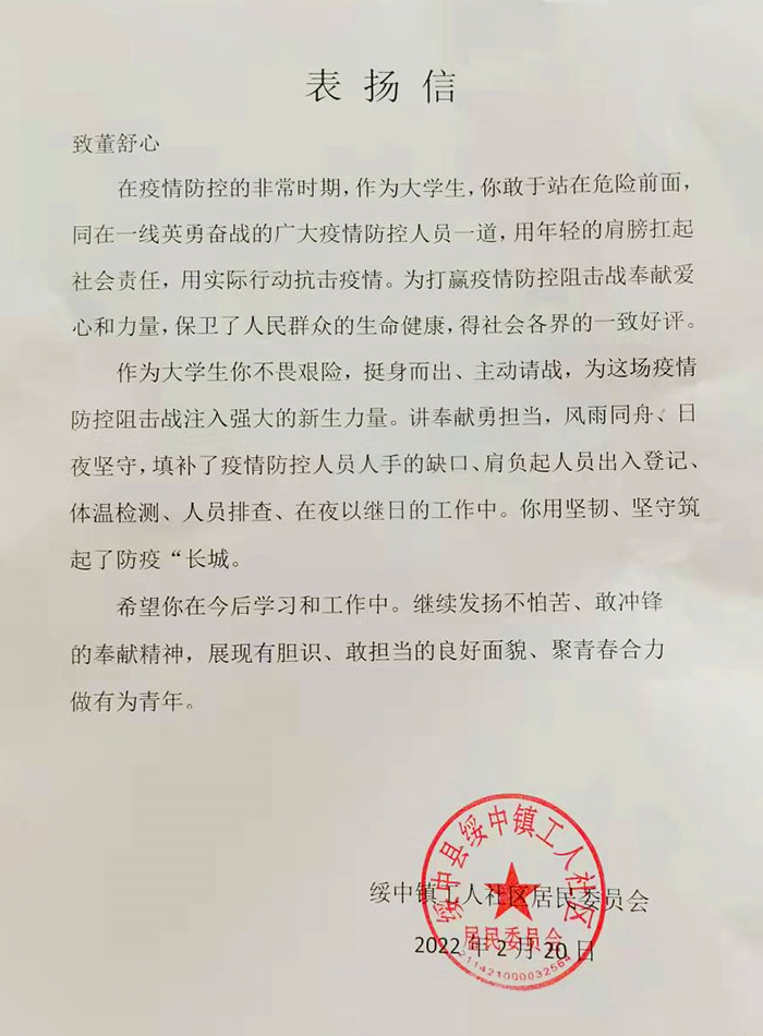 董舒心感谢信