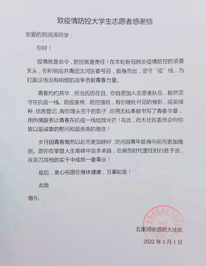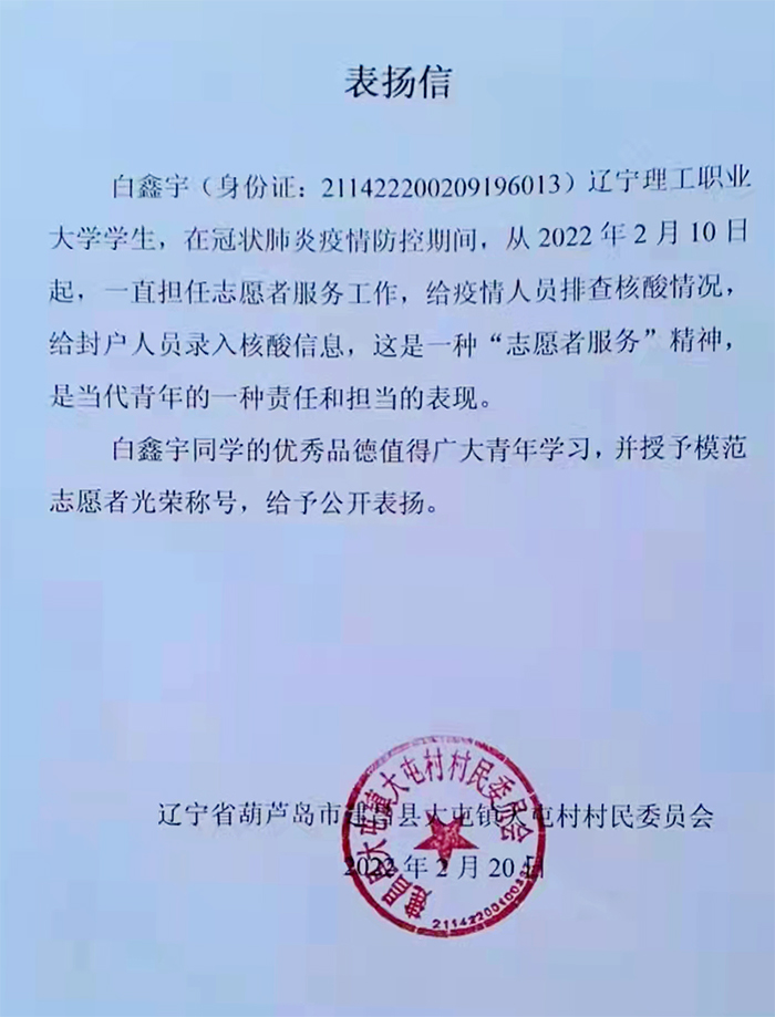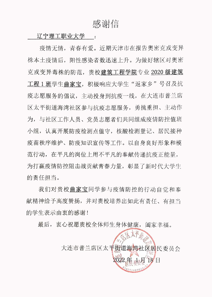 在一封封感谢信中,我们清晰的看到了辽宁理工职业大学莘莘学子在疫情面前表现出的勇敢与执着,责任与担当。建筑学院2020级建筑工程1班的曲家宝在“返家乡”活动中说:“我们挨家挨户敲门请配合检查时,有人以为我们是骗子不开门,还有的就是假装不在家,即便这样我们也不会放弃,不遗漏任何一家。今年是我第三次穿上防护服,同时也希望这是最后一次,期盼疫情早日结束”。