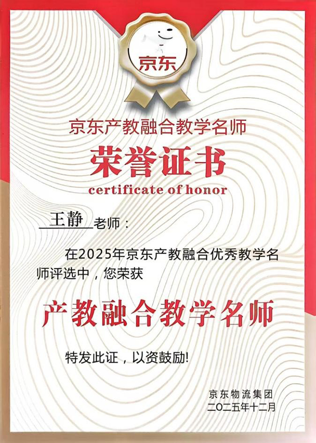 在同期举行的京东产教融合成果评选中,数字商务学院凭借与京东集团长期稳定、深入务实的合作成效,其“京东智慧物流产业学院”在全国众多合作院校中脱颖而出,获评“优秀产业学院”,学校被授予“十佳合作单位”。这一荣誉是对学院在校企共建产业学院、实践基地建设、课程资源开发及人才培养模式创新等方面工作的充分肯定。同时,学院现代物流管理专业主任王静教授被授予“产教融合教学名师”称号。