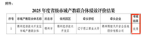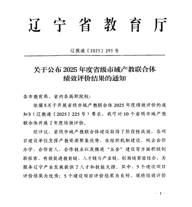 近日,辽宁省教育厅《关于公布2025年度省级市域产教联合体绩效评价结果的通知》(辽教通〔2025〕295号)明确,通过对全省10个省级产教联合体年度绩效评价,5个建设项目评价结果为优秀,5个建设项目评价结果为良好。以我校为牵头院校的锦州市经济技术开发区市域产教联合体建设项目为5个优秀建设项目之一。