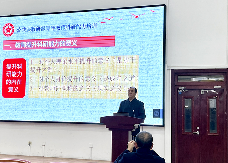为营造浓厚学术氛围,以科研促进教学水平,增强青年教师科研意识,提升青年教师科研能力,副校长孟庆男教授于10月26日下午1点10分在北校区主楼一楼报告厅为马克思主义学院、基础教研部、体育教研部青年教师作了一场精彩纷呈的学术讲座。讲座由马克思主义学院院长张觉力教授主持,全体青年教师现场聆听。