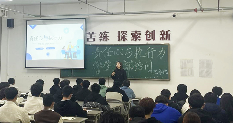 为进一步提升机电学院学生干部责任心和执行力,4月13日晚18:00,机电学院在主楼306教室开展了以“强化责任抓落实提升干部执行力”为主题的学生干部培训,本次会议由机电学院团总支书记刘嘉媛主持,机电学院学生组织全体成员参加此次培训。