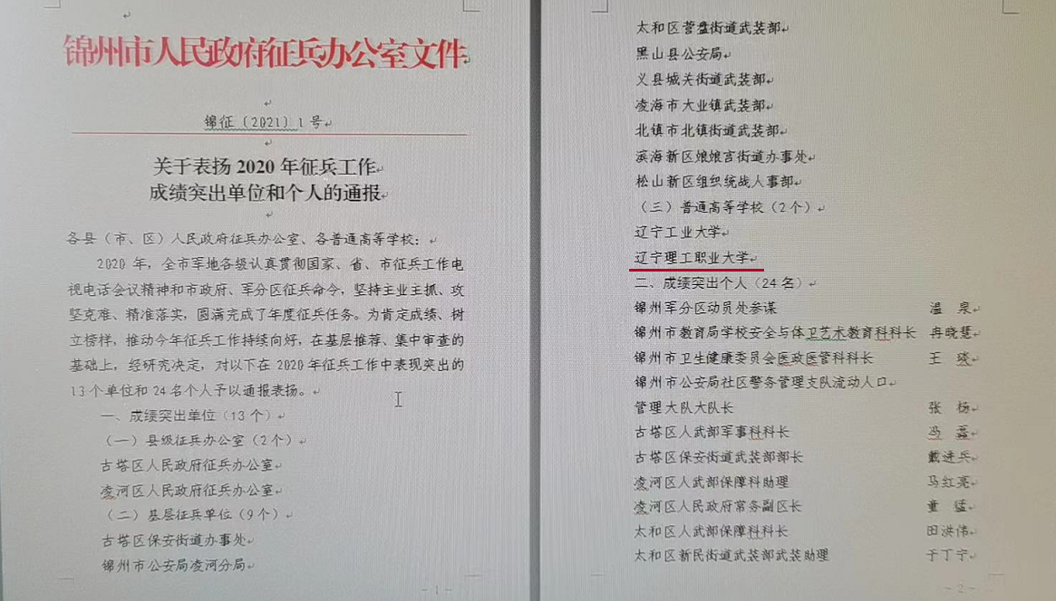 2021年是部队“一年两征”改革落地实施的第一年,是国务院、中央军委着眼新时代强军目标做出的重大决策部署。面临新形势新任务新要求,我校强化责任意识和目标意识,以“征兵育人”为宗旨,开展大学生征兵工作。精心宣传,精准动员,精密组织,精确指导,精细化服务,圆满完成一年两征的任务目标。今年五月荣获“锦州市征兵工作成绩突出单位”。