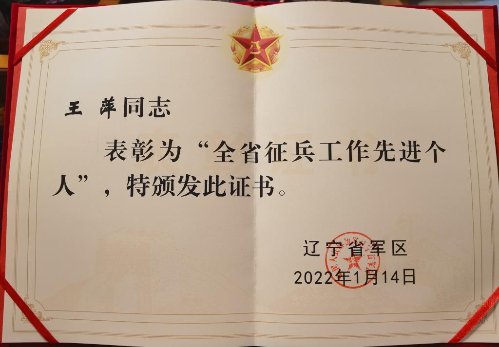 经辽宁省教育厅征兵工作服务中心遴选推荐,辽宁省政府征兵办公室和辽宁省军区审核通过,我校征兵工作部门负责人王萍处长被评为2021年度“辽宁省征兵工作先进个人”。