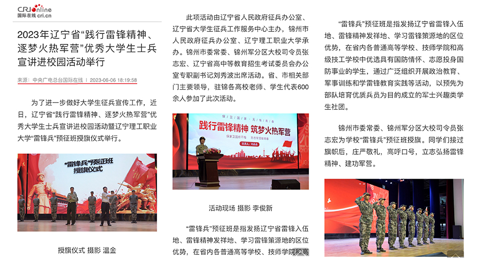我校承办的“2023年辽宁省‘践行雷锋精神,逐梦火热军营’”优秀大学生士兵宣讲进校园活动暨辽宁理工职业大学“雷锋兵”预征班授旗仪式在中央广电总台国际在线宣传报道。