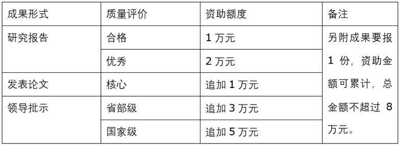 1、立项即预支付5000元作为启动资金。研究报告根据结题鉴定质量予以一次性资助余额;发表论文、省部级党政领导批示等成果作为后期追加认定形式予以资助,同一类别成果按最高资助,总资助额度不超过8万元;