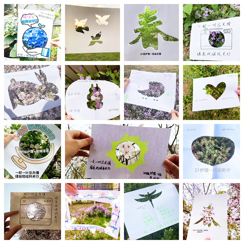此次活动主要围绕“镂空画创意大自然”这一主题开展。在本次活动中,同学们通过自己的奇思妙想以及动手实践,将一个个镂空图案从想法落实到了纸上,并在自己的作品上写下“一枝一叶总关情,绿色地球我来行”这一誓言,最后与校园内的烂漫景色进行合拍。在独特的形状的映衬下,校园美景更显别样动人之色。在与景色合拍的行动中,同学们将保护生态环境,守护绿色校园的理念传播到学校的每个角落,也将环境保护意识潜移默化的植入每个人的心中。