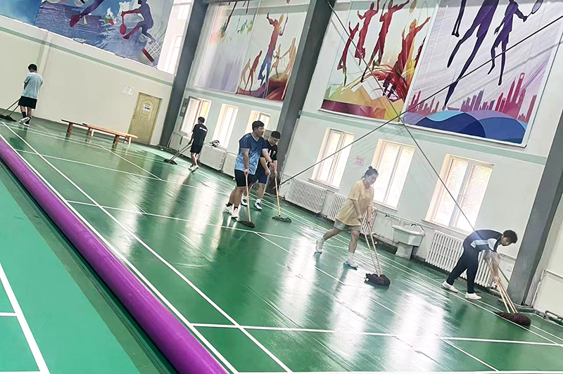 在排查羽毛球馆的过程中,张美琪老师发现羽毛球馆场地塑胶出现返潮现象,导致了不同程度的鼓包。为了让同学们享受更好的打球体验感,张美琪老师迅速组织羽毛球校队成员,利用中午休息时间对羽毛球馆场地进行整修,并进行了清扫。