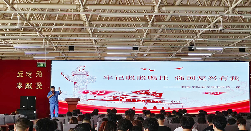 为了更好的贯彻落实党的二十大精神,深入开展学习贯彻习近平新时代中国特色社会主义思想主题教育,全面贯彻党的教育方针,落实立德树人根本任务,教育引导广大学生把个人理想追求融入国家和民族的事业中,树立远大志向、培育美好心灵,培养担当民族复兴大任的时代新人,以不负时代、不负韶华的奋进姿态开启2023年秋季学期新征程。物流学院邀请了“辽宁省劳动模范”、“辽宁青年五四奖章”、“锦州市劳动模范”、“锦州市优秀青年岗位能手”、“锦州市五一劳动奖章”获得者、锦州港杂货码头公司经理,也是物流学院德育导师的丁成涛经理,于8月30日下午14:00在南校区图书馆报告厅为全体物流学院在校生上了一堂生动的开学第一课。