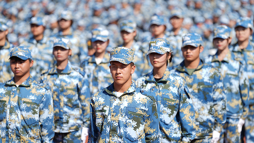 大会在庄严的国歌中拉开帷幕,参训新生如锋刃出鞘,齐聚校园训练场。